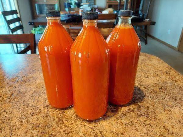 This batch started with about 5 lbs. of cayenne peppers, and yielded about 1 1/2 gallons of good sauce.