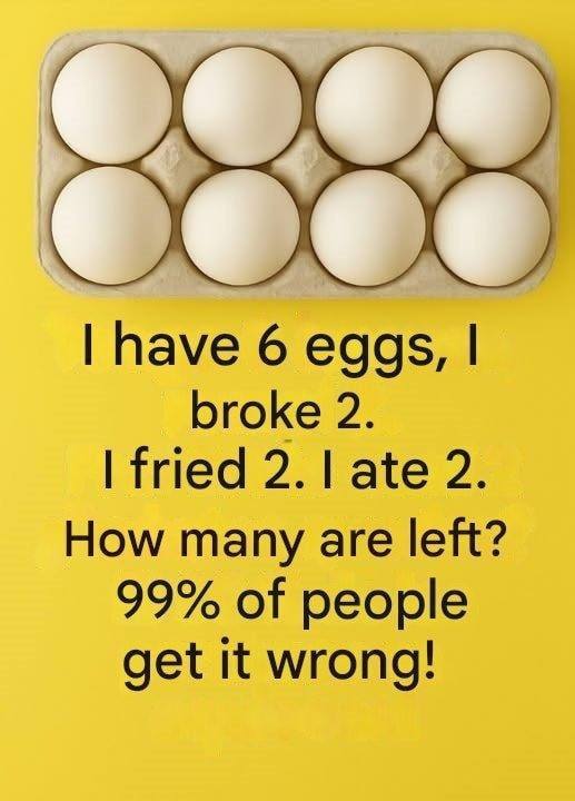 “I have 6 eggs. I broke 2. I fried 2. I ate 2. How many eggs do I have left?”