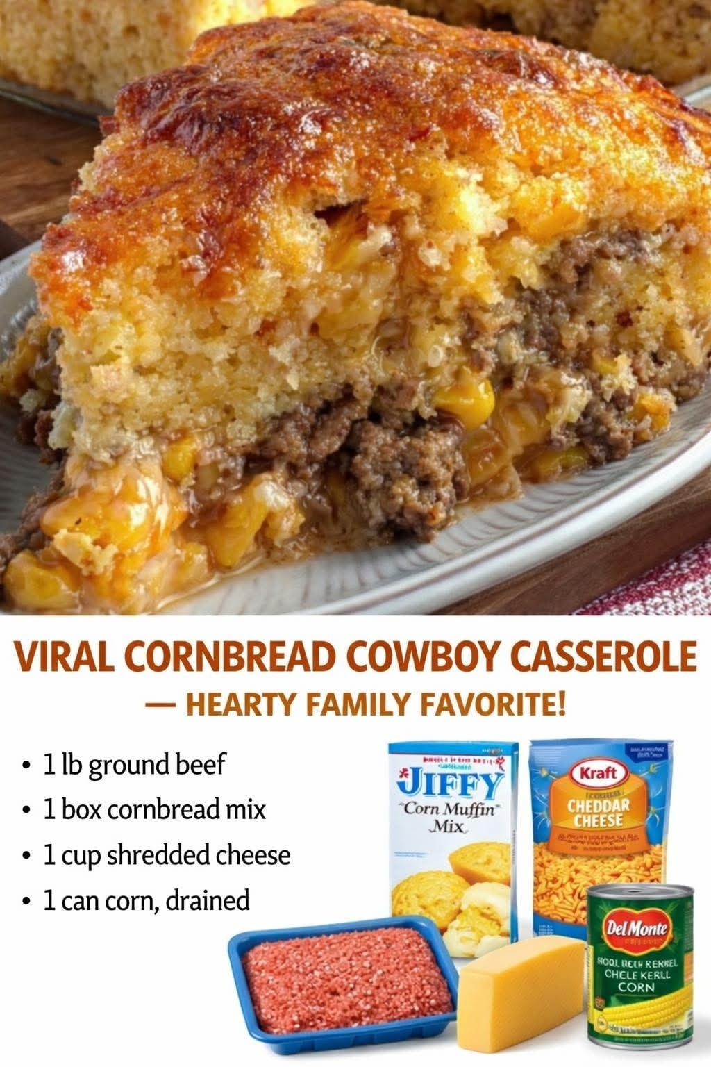 Viral Cornbread Cowboy Casserole is the ultimate comfort-food dinner that’s taken social media by storm—and for good reason. This hearty, family-friendly casserole layers savory seasoned ground beef, beans, corn, and creamy elements beneath a golden, fluffy cornbread topping that bakes to perfection in one pan. It’s warm, filling, and packed with bold, satisfying flavor in every bite.
